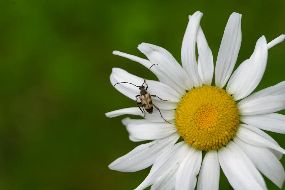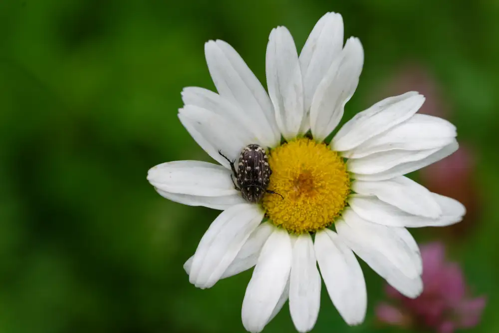 Kein Maikäfer und auch kein Junikäfer tummelt sich hier auf der Margerite. Es ist vielmehr der Gartenlaubkäfer (Phyllopertha horticola), der manchmal als Junikäfer bezeichnet wird. Der „Junikäfer“ an sich existiert nicht, der Name wird landläufig wegen seines Auftretens verschiedenen Käfern zugedacht. Der behaarte Hinterleib und die sechsmalige Reihe schwarzer Punkte auf jeder Flügeldecke lassen ihn ziemlich sicher identifizieren. Er frisst Blätter von Laubbäumen, mag aber auch Kirsch- und Rosenblüten. Ein paar angefressene Blätter sind jedoch kein Problem. Und er dient seinerseits manchen Vögeln als Speise.